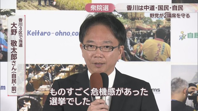 香川3区は自民・前職の大野敬太郎さん(57)が国民と維新の新人に3万5000票以上の差をつけ、6回連続の当選を果たしました。