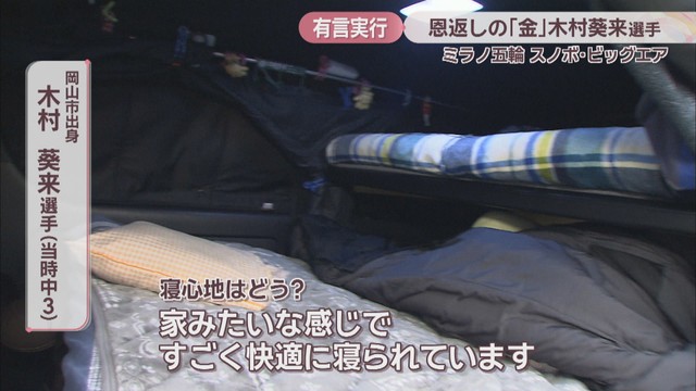 「(Q.寝心地はどう?)家みたいな感じですごく快適に寝られてますね。(Q.両親のサポートは?)もう感謝しかないですね。この恩返しをしたいです。スノーボードで結果を出して」