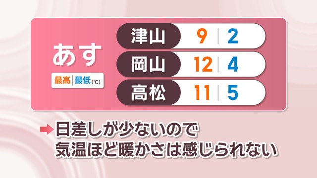 最高気温は津山市が9℃、岡山市が12℃、高松市が11℃で、平年並みかやや高くなりそうです。