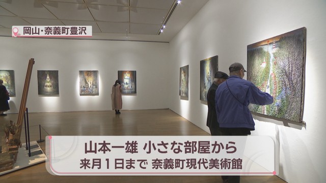 3月1日まで奈義町現代美術館で開かれている89歳の画家、山本一雄さんの作品展「小さな部屋から」。