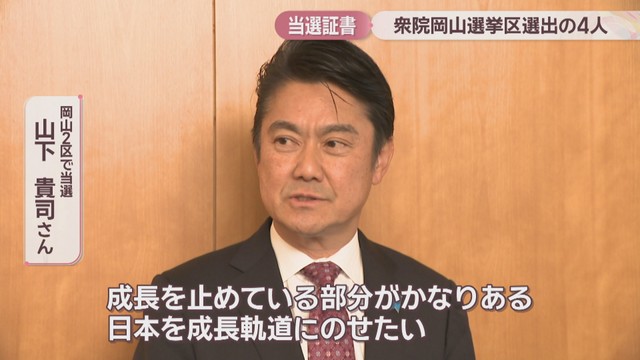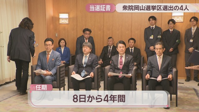 2月8日に行われた衆議院議員選挙の岡山県の小選挙区で当選した自民党の4人が11日、当選証書を受け取りました。