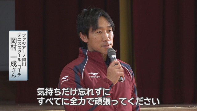 岡山県倉敷市出身の元プロテニス選手で、指導者の岡村一成さんが12日、地元の小学生と交流しました。