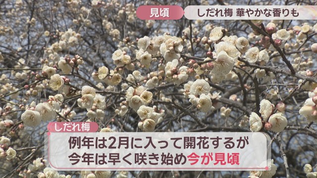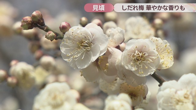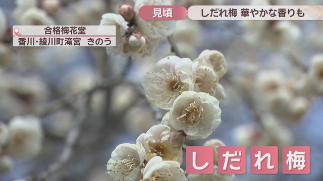 13日は晴れて日差しのもとでは過ごしやすい陽気となりました。そんな中、香川県綾川町では「しだれ梅」が見頃を迎えています。