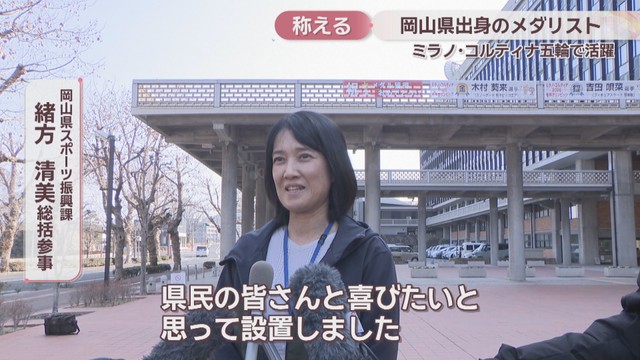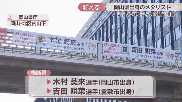 ミラノ・コルティナオリンピックでメダルを獲得した岡山県出身の選手を称え、県庁に横断幕が掲げられました。