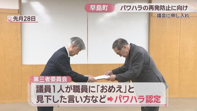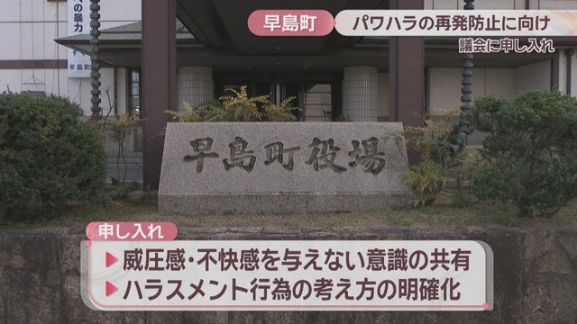 岡山県早島町は12日、議会に対しパワハラの再発防止に向けた申し入れを行いました。