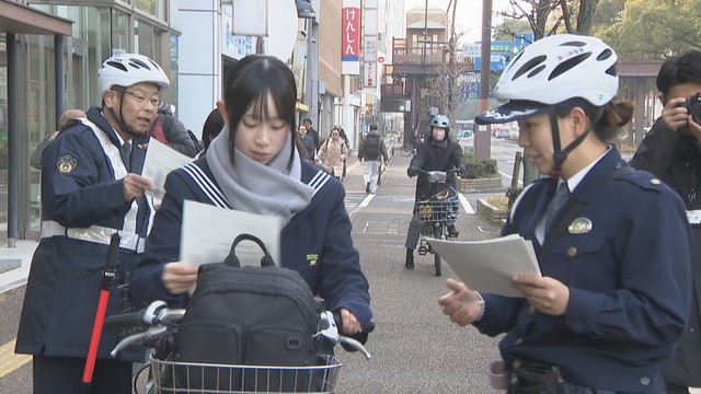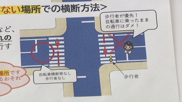 自転車の二人乗りやながら運転などに対して4月から反則金が課されるのを前に、自転車のマナー向上のために県警が行ったものです。今回は交差点の渡り方について重点的に周知しました。