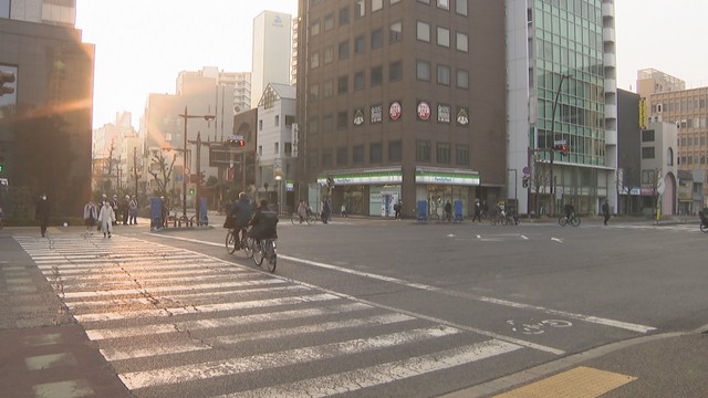 「歩車分離式信号になってからきょうで20日。この交差点では、きょうも多くの人が行き来しています。自転車に乗った人も多く見られます」