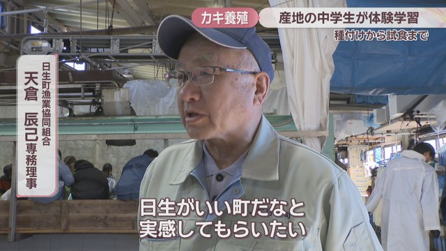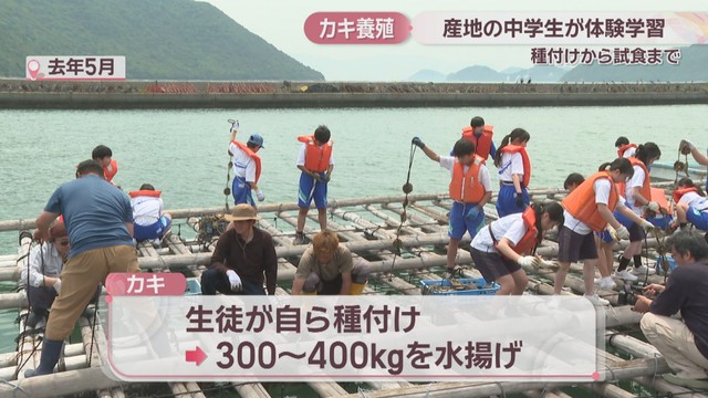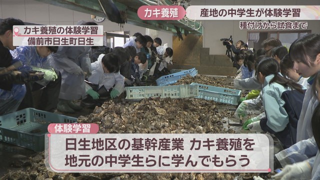 備前市日生地区の基幹産業、カキの養殖について地元の中学生らに学んでもらおうと、毎年行われている体験学習です。