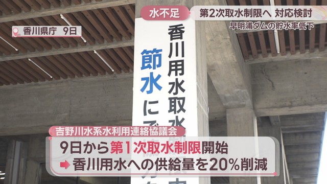 貯水量の低下を受け、2月9日から香川用水への供給量を20%削減する第1次取水制限が行われています。