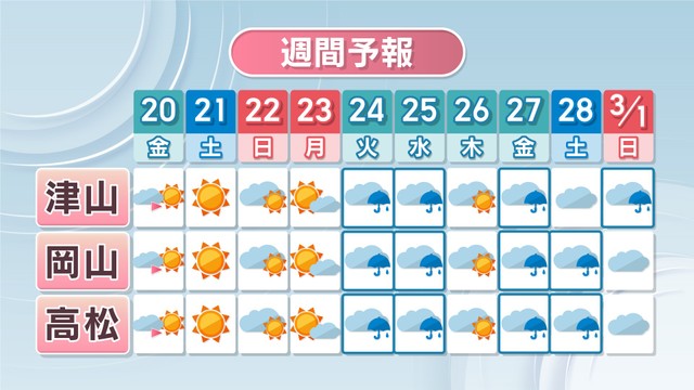24日(火)から前線や低気圧が接近。24日(火)や25日(水)、27日(金)、28日(土)と、雨の降る時間がある予想で、これまでと比べると雨の降る日は増えそうです。