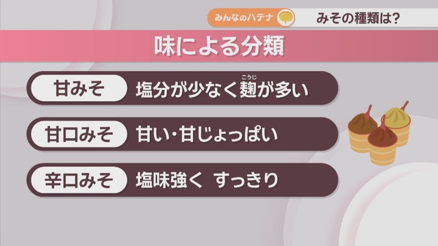 さらに味で分類すると、塩分が少なく麹を多く使用しているのが「甘みそ」。甘かったり甘じょっぱかったりして一番多く流通している「甘口みそ」。塩味が強く、すっきりとした味わいの「辛口みそ」の3種類に分類できます。
