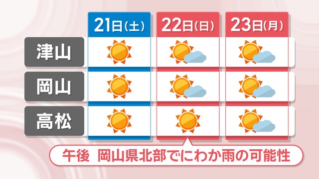 連休中は各地で晴れやくもり。ただ、22日(日)の午後、岡山県北部ではにわか雨の可能性がありますので、折り畳み傘があると安心です。