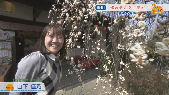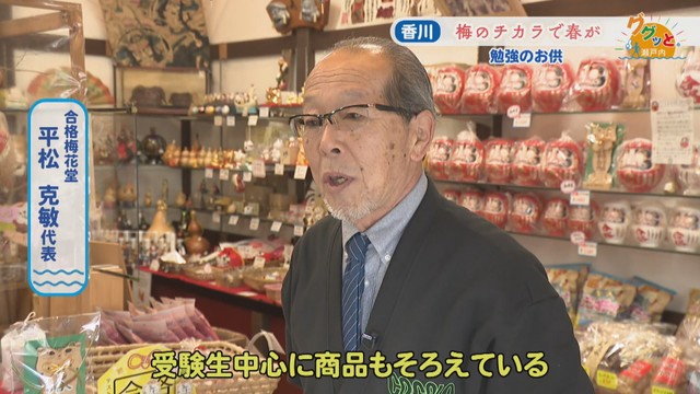 「しだれ梅の華やかな香りがしっかり香ってきます。今がちょうど見頃ですね。そしてお店に入ると合格祈願に関する商品が300種類ほど並んでいます」