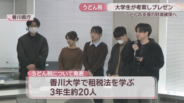 香川県や高松市の職員を前に「うどん税」について発表したのは、香川大学で租税法を学ぶ3年生約20人です。