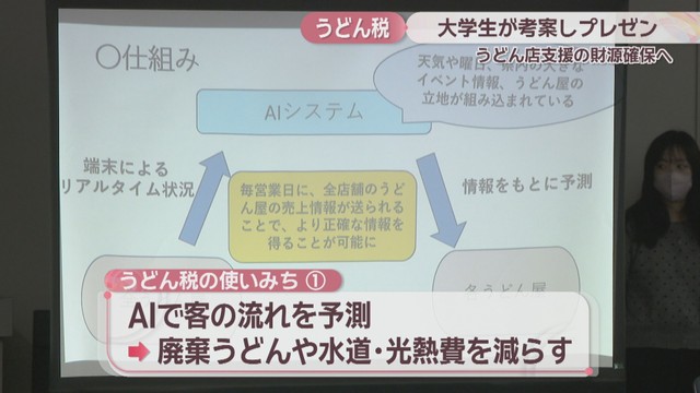 徴収したうどん税は、AIで客の流れを予測するシステムを作ってお店が廃棄するうどんや水道・光熱費を減らしたり、県が小麦粉を仕入れて店に安く卸したりすることに使われる想定です。気になるプレゼンの反応は?