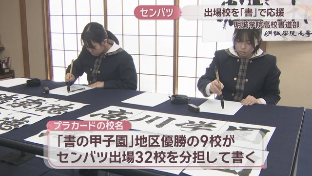 明誠学院高校書道部の1年生4人が書くのは、センバツの入場行進などで使うプラカードの校名です。