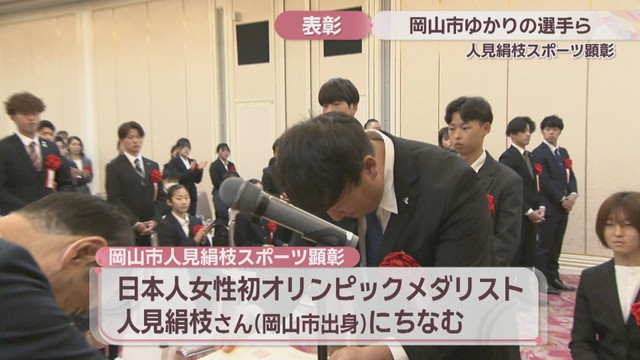 23日、スポーツで優秀な成績を収めた岡山市ゆかりの選手らをたたえる「人見絹枝スポーツ顕彰」の表彰式が行われました。