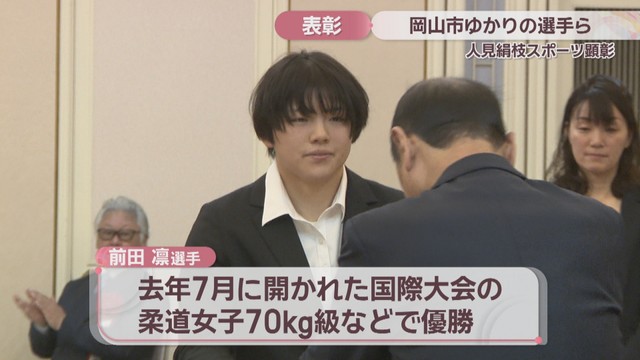 2025年度は個人67人と9団体が受賞し、「特別スポーツ栄誉賞」に選ばれた柔道の前田凛選手が岡山市の大森市長から表彰状を受け取りました。
