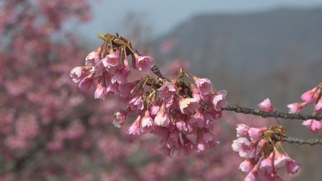 小豆島町の三都半島で淡いピンク色の花を咲かせているのは「寒桜」です。1976年の台風で土砂崩れの被害を受けた後、地域整備の一環で植えられました。