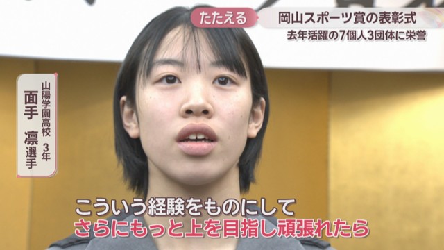 個人賞を受賞したのは、テニスの全日本選手権女子シングルスで初優勝を飾った倉敷市出身の岡村恭香選手、卓球インターハイ・女子シングルスで優勝し、自身初となる世界選手権の代表にも選ばれた山陽学園の面手凛選手らが選ばれました。