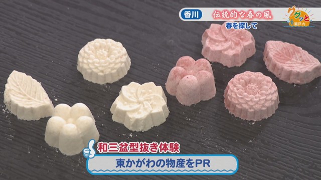 優しいくちどけが特徴の和三盆。讃州井筒屋敷では、桜や梅など春を感じる形のものを作れます。