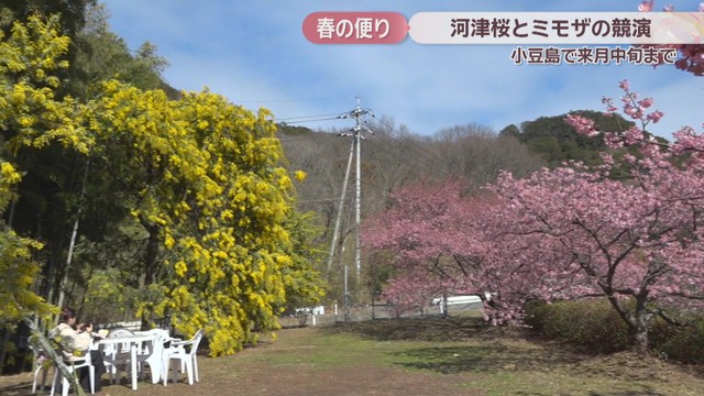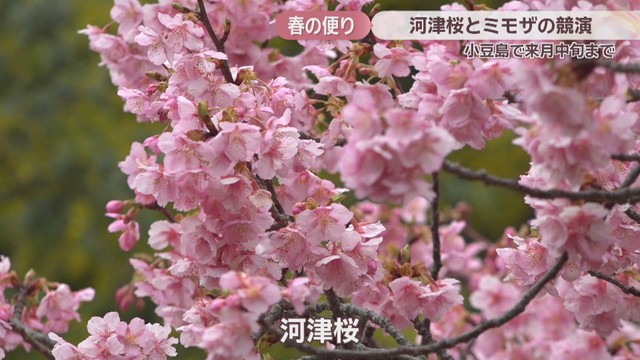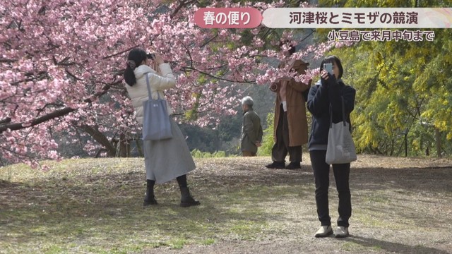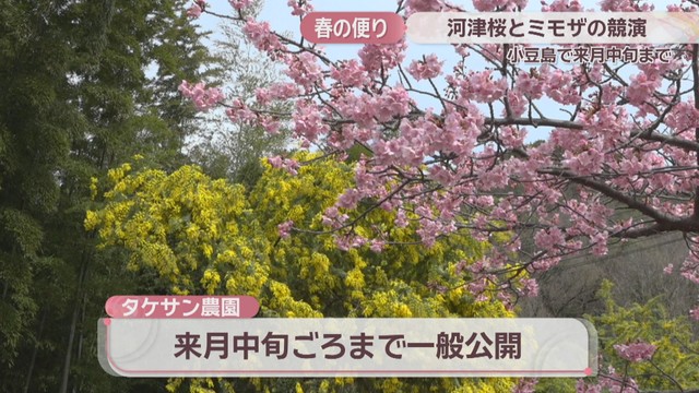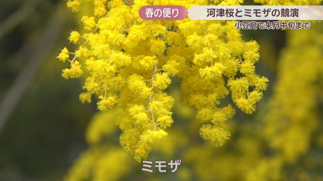 香川県の小豆島で、河津桜とミモザが一足早く春の訪れを告げています。