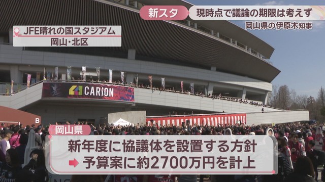 岡山県が協議体を設置して建設の検討を進めるとしている新しいスタジアムについてです。伊原木知事は27日、「現時点で期限は考えていない」とした上で、スピード感をもって議論していきたいとの考えを示しました。