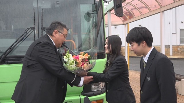 バスで通学していた生徒を代表して、秋井息吹さんらが小豆島オリーブバスの運転手に感謝を込めた花束を手渡しました。