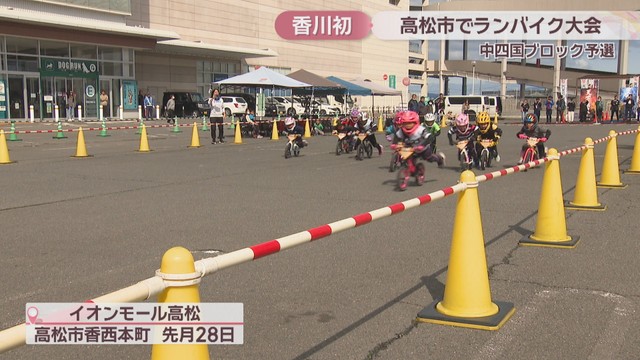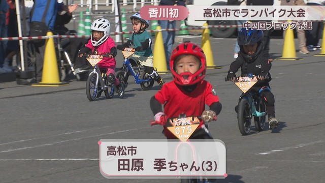 ペダルのない自転車にまたがり、地面を蹴りながら進む「ランバイク」の大会が2月28日、高松市で開かれました。