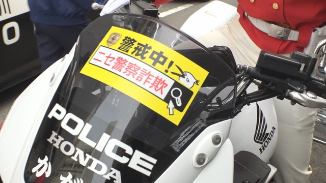 「警戒中 ニセ警察詐欺」と書かれたステッカーをパトカーと白バイ約20台に貼り、パトロールなどを行います。