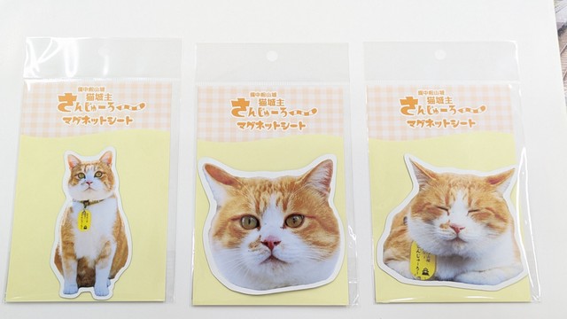 マグネットシートは、猫城主さんじゅーろーの「かお」「香座座り」「おすわり」の愛くるしい姿が転写された3種類です。