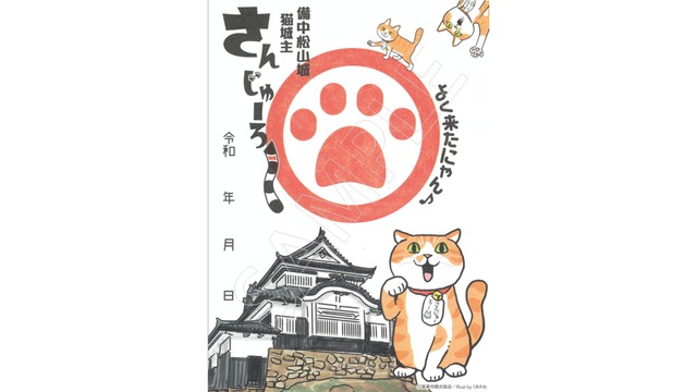 御城印(お猫印)には、備中松山城のイラストに猫城主さんじゅーろーの3つのキャラクターが描かれています。
