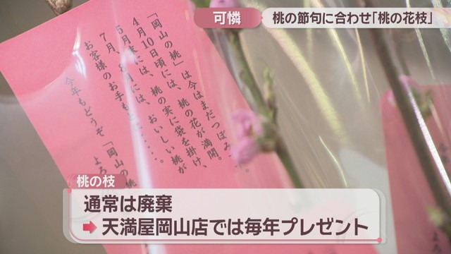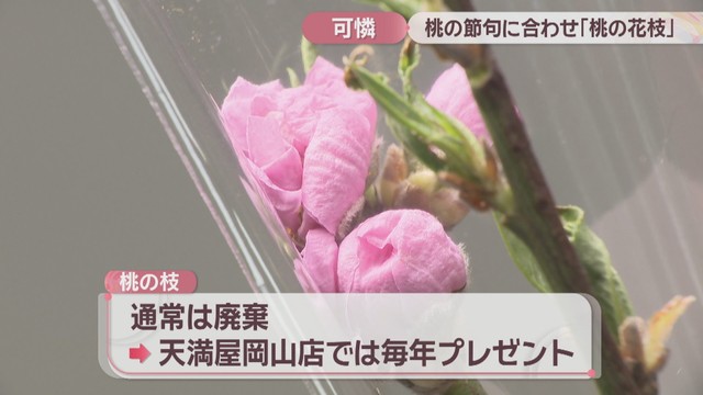 桃の実を育てるのには不要で普段は捨てられる枝ですが、天満屋岡山店では桃の節句に合わせて毎年、来店客にプレゼントしています。