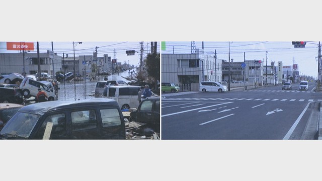 岡山市の職員が撮影した宮城県石巻市の様子を撮影した2枚。震災直後は道路に車や木材が散乱しています。一方、2020年の写真からは「復興」を感じることができます。