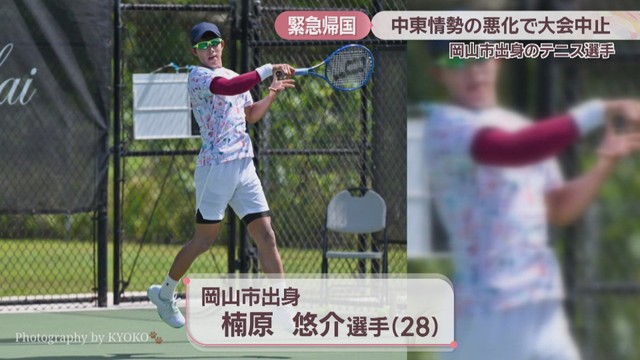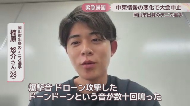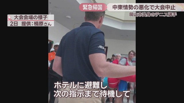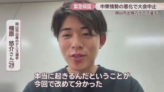 中東情勢の悪化を受け、UAE・アラブ首長国連邦で開かれていたテニスの国際大会が中止になりました。参加していた岡山市出身の選手が緊急帰国し、心境を語りました。