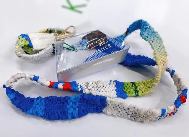 また、入賞者(男女1~8位)にはメダルに特別なリボンが付いています。このリボンは香川県内のイベントの盛り上げに貢献し、役目を終えたのぼり旗を織り上げたものです。香川県内の「さをり織」の作家たちに協力してもらい、手作業で仕上げられています。