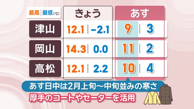 また、13日は広い範囲で雲が広がりやすい予想です。岡山県北部は山沿いを中心に雨や雪の降る時間があり、岡山県南部や香川県でもにわか雨の可能性があります。