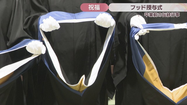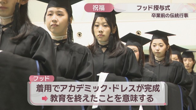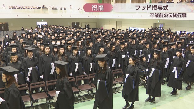 学生は「大きな希望と固い決意を持ってこのフッドをいただきます」と誓いの言葉を述べ、一斉にかぶりました。ノートルダム清心女子大学では14日、卒業式が行われます。
