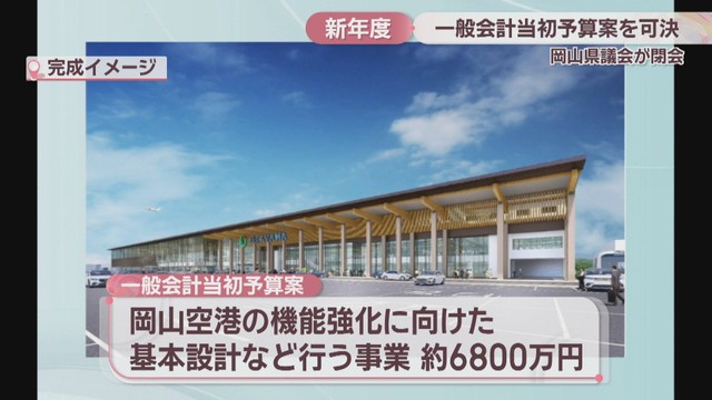 岡山空港の国際線が2便同時に発着できるようにするなど、機能強化に向けた基本設計などを行う事業に、約6800万円が盛り込まれています。