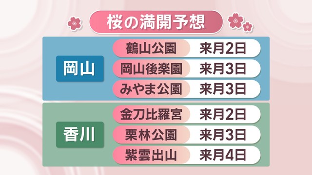 ウェザーニューズによりますと岡山では岡山市の岡山後楽園で4月3日に満開の予想だということです。また香川では、高松市の栗林公園でも4月3日に満開の予想だということです。