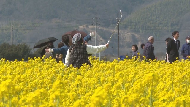 笠岡市の笠岡ベイファームには菜の花畑が3カ所があり、このうち最も広い約4ヘクタールの畑で1000万本の菜の花が見頃を迎えています。