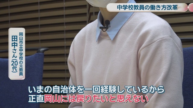 岡山市の公立中学校で教員をしていた田中さん(仮名・20代)。田中さんは岡山市の教員時代、部活動に加え、授業の準備などで夜遅くや休日も学校にいることが多かったと話します。