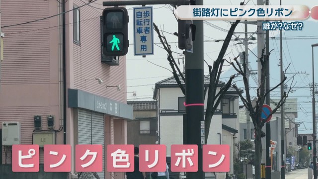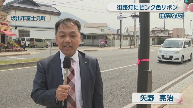 「坂出市富士見町の県道沿いに来ています。街路灯に付いたこのピンクのリボン。反対側にも、さらにほとんどの街路灯に巻かれているんです」