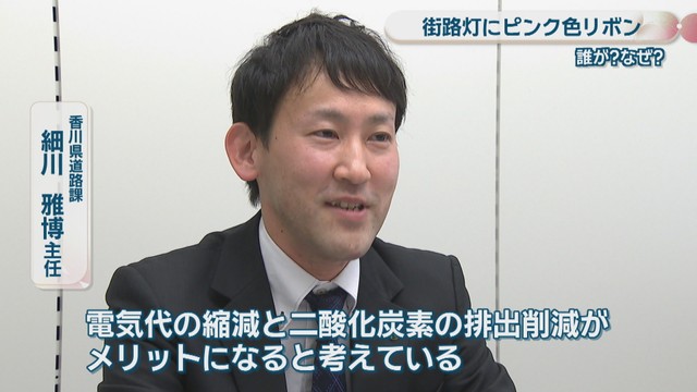 ピンク色のリボンが取り付けられた街路灯は、3月頃から坂出市や丸亀市などの県道沿いで見かけるようになりました。