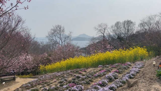 香川県三豊市の志々島の山上にある「天空の花畑」ではソメイヨシノやネモフィラなど季節の花が見頃を迎えています。