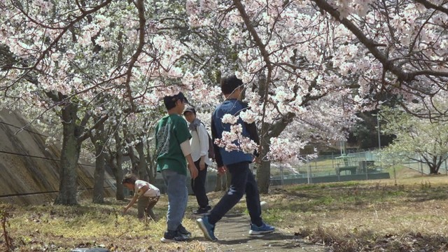 淡いピンクの花が里山に映え、のどかな春の景色が広がっています。訪れた人たちは満開のサクラの下で思い思いにお花見を楽しんでいました。