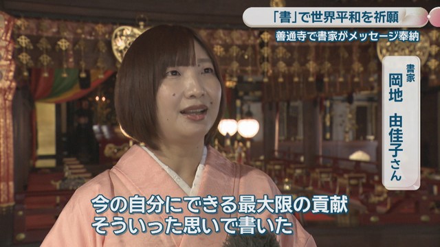 「世界平和のために自分ができることは何だろうと考えたときに、小さいころからずっと共に過ごしてきた書道、文字を書く行為で祈りを世界に届けることが今の自分にできる最大限の貢献と思い、そういった思いで書かせていただいた」