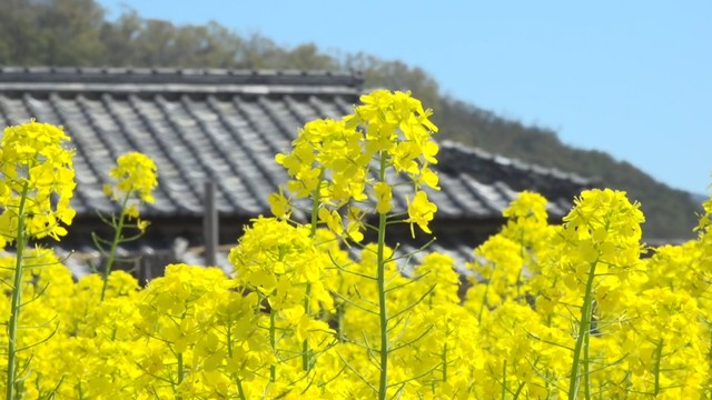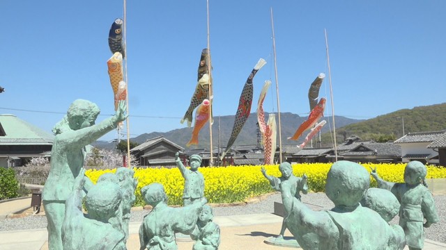 香川県小豆島町の「二十四の瞳映画村」で約3万本の菜の花が見頃を迎えています。菜の花畑の上には12匹のこいのぼり。
