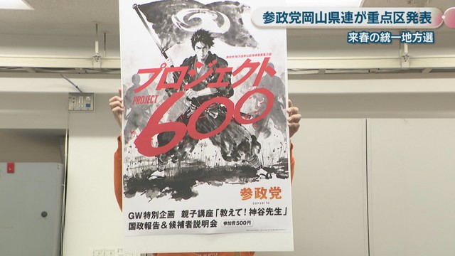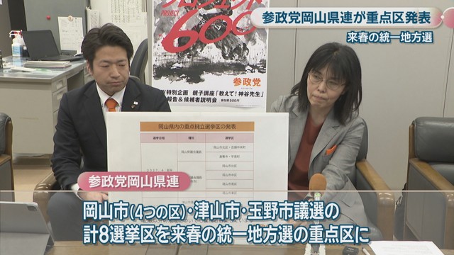 参政党岡山県連は2027年春に予定されている統一地方選のうち、岡山県議選の「岡山市北区・加賀郡選挙区」と「倉敷市・都窪郡選挙区」、岡山市議選の4選挙区、津山市議選、玉野市議選の合わせて8選挙区を重点区にすることを発表しました。