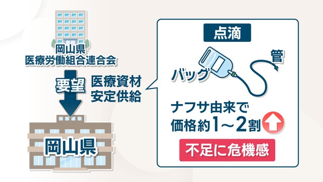 医労連によると、点滴の管や点滴のバッグなどがナフサ由来であるため、すでに価格が1~2割アップしているそうです。不足すると命に関わるため、供給に影響が出ないよう岡山県に要望したということです。